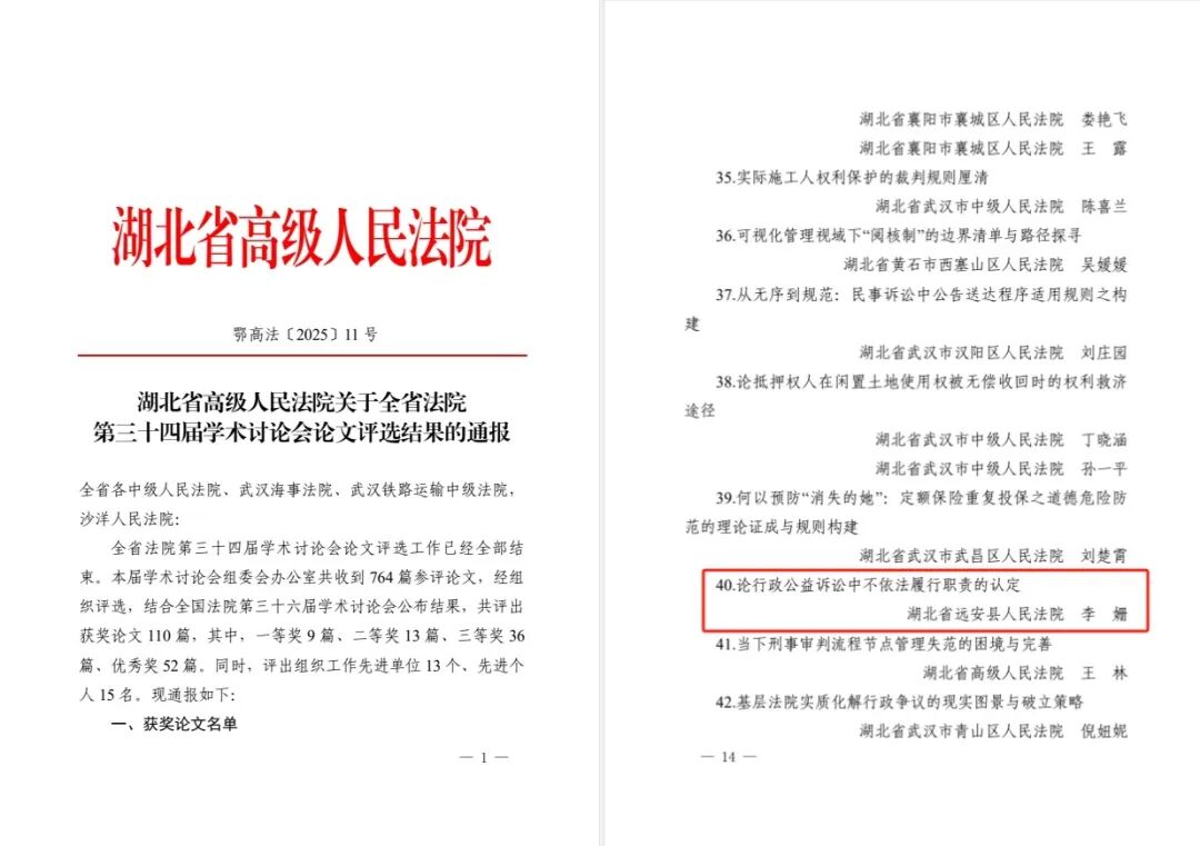近日,湖北省高级人民法院发布《关于全省法院第三十四届学术讨论会论文评选结果的通报》。其中,我院干警李姗参与撰写的《论行政公益诉讼中不依法履行职责的认定》获优秀奖。这是远安县法院在学术研究领域取得的又一重要成果,展现了法院干警扎实的理论功底和司法实践能力。