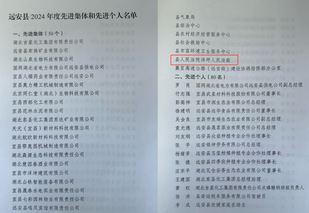 洋坪人民法庭下辖洋坪镇、河口乡2个乡镇,并归口管理全县环资类案件。2024年,洋坪人民法庭共受理民事一审案件133件、环资类刑事一审案件4件、司法确认4件,案件数较上一年度同比减少27.75%,审限内结案率100%,民事调撤率68%,一审服判息诉率97%,无改判、发回重审案件,法庭服务基层治理成效显著。 洋坪人民法庭从打造集“环资审判+生态修复+法治宣传”的专业化法庭,向创建新时代“枫桥式人民法庭”转型,以“办案公正、解纷高效、便民最优”为目标,积极探索时代经验和地方特色的“枫桥式人民法庭”;以挂职党委委员为桥梁,及时参与乡镇重大或群体性纠纷,将纠纷工作做在诉前;以司法服务站、共享法庭等便民建设为依托,为各村(社区)化解矛盾纠纷提供法律保障。 洋坪人民法庭积极探索以劳代偿新模式,既减轻了被告人的经济负担,又修复了被破坏的环境资源。对环境资源巡回审判工作提出新要求,着力形成“法院院长+检察长”审判、公诉模式,邀请“两代表一委员”及县公安局、县林业局等相关负责人、村干部、护林员等到场观摩庭审,倡导群众共同做生态环境的守护者,该做法得到《湖北日报》等主流媒体的广泛宣传。 荣誉既是终点,更是起点。洋坪人民法庭将继续秉持司法为民的宗旨,不断提升司法服务水平,为远安县法治建设和社会发展做出更大的贡献。
